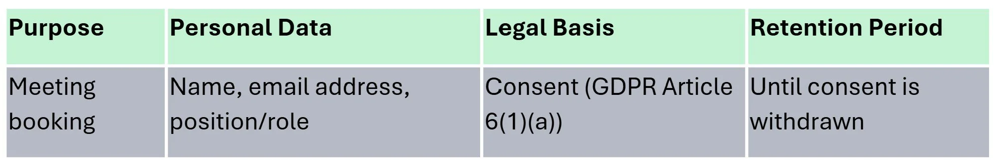 The table below provides an overview of how we process personal data on this website, including the purpose, what data is involved, the legal basis, and how long we keep it.